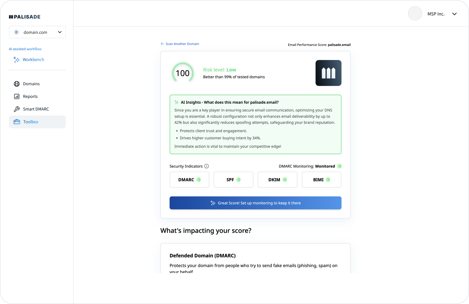 MSPs looking for a simplified DMARC solution for their clients, particularly those with less complex needs, will also find Palisade appealing due to its ease of use. While it can scale to larger organizations, its core strength lies in providing accessible and effective DMARC management for those who prefer clarity over an abundance of advanced features.