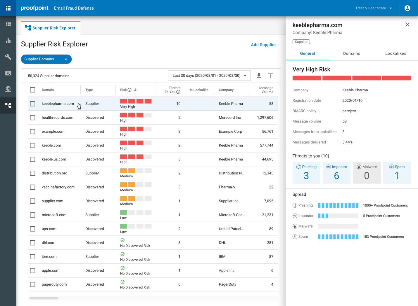 Beyond DMARC, the product offers extensive capabilities for organization reputation protection, such as preventing domain and lookalike domain spoofing. It provides a 360-degree view across the email ecosystem, dynamically identifying potential malicious lookalike domains and showing which domains attackers have targeted. A notable feature is its Virtual Takedown Service for malicious lookalikes, which is a proactive measure against impersonation. Proofpoint also provides a Supplier Risk Explorer, automatically identifying suppliers and assessing their risk based on impostor threats, phishing, malware, and spam.